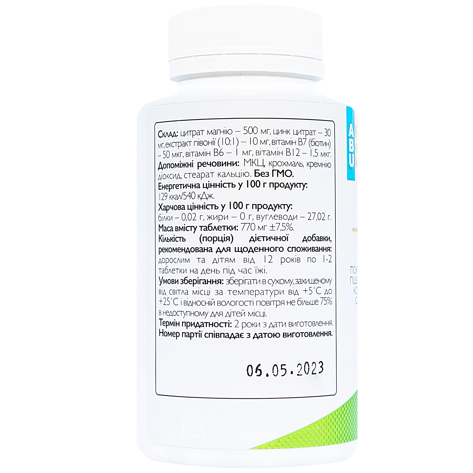 • Магній (у формі цитрату) — 500 мг. Легкозасвоювана форма. Знижує стрес, заспокоює нервову систему, покращує сон, зменшує м’язові спазми, судоми та втому. Підтримує серцево-судинну систему