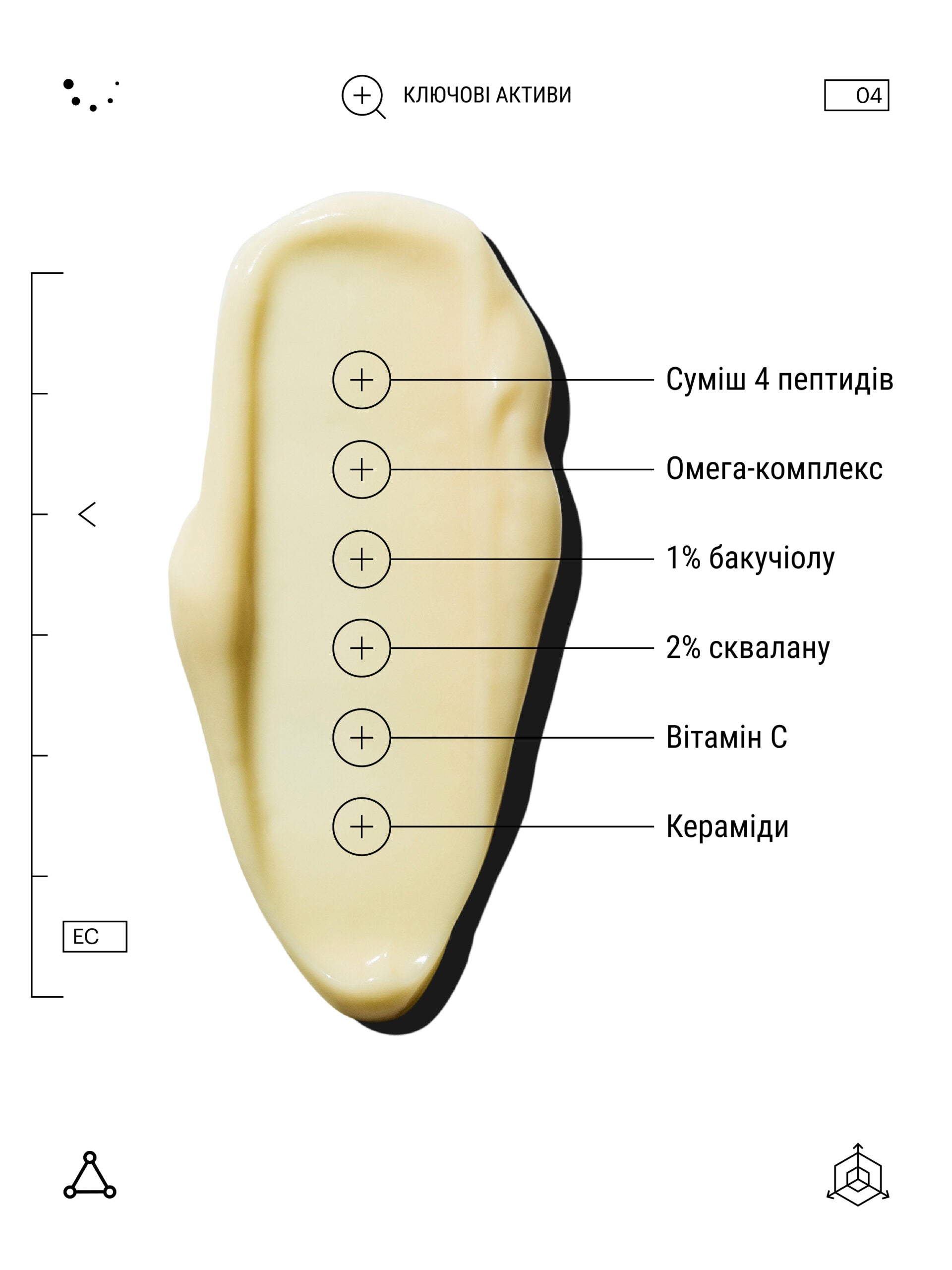 - Пептиди — стимулюють синтез колагену, зменшують мікрозапалення та зміцнюють тонку шкіру під очима