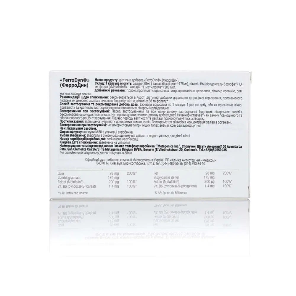 Metagenics FerroDyn №30 — це комплекс для щоденної нутритивної підтримки, що містить бісгліцинат заліза, вітамін B6 та фолат. Формула допомагає доповнювати раціон залізом у поєднанні з активними кофакторами, які підтримують нормальні обмінні процеси та загальний баланс організму. Підходить для дорослих як частина щоденного раціону.