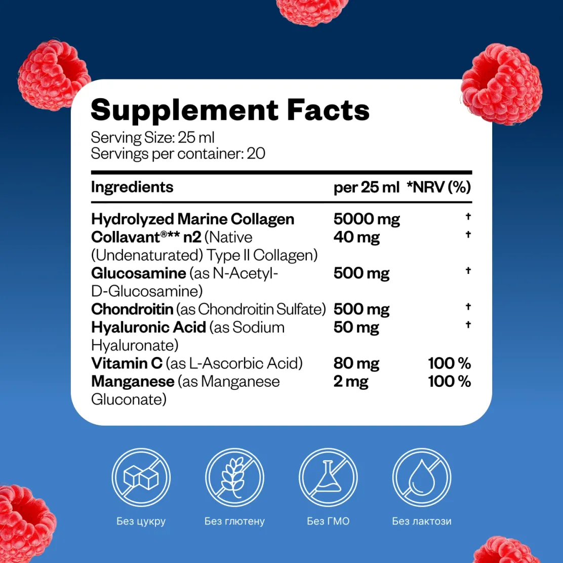 ОЧИЩЕНА ВОДА, ГІДРОЛІЗОВАНИЙ МОРСЬКИЙ КОЛАГЕН (РИБА, ТИПИ I ТА III), ПІДСОЛОДЖУВАЧ: КСИЛІТ, ХОНДРОЇТИНУ СУЛЬФАТ, N-АЦЕТИЛ-D-ГЛЮКОЗАМІН, L-АСКОРБІНОВА КИСЛОТА, РЕГУЛЯТОР КИСЛОТНОСТІ: ЛИМОННА КИСЛОТА, АРОМАТИЗАТОР МАЛИНОВИЙ, КОНСЕРВАНТ: СОРБАТ КАЛІЮ, ГІАЛУРОНАТ НАТРІЮ, КОЛАГЕН COLLAVANT® N2, ЗАГУСНИК: КСАНТАНОВА КАМЕДЬ, ГЛЮКОНАТ МАРГАНЦЮ, ПІДСОЛОДЖУВАЧ: СТЕВІОЛОВІ ГЛІКОЗИДИ ЗІ СТЕВІЇ