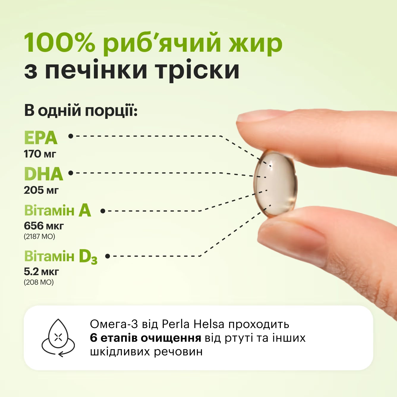 Perla Helsa Омега-3 із Тріски — це високоякісна добавка з натурального тригліцеридного риб’ячого жиру, отриманого з печінки тріски дикого вилову в Ісландії. Формула збагачена природними джерелами EPA, DHA, а також вітамінами A та D3, які потрібні для здоров’я зору, шкіри, імунітету та гормональної рівноваги. М’які желатинові капсули легко ковтаються, а чистий склад без домішок робить продукт безпечним для щоденного вживання.